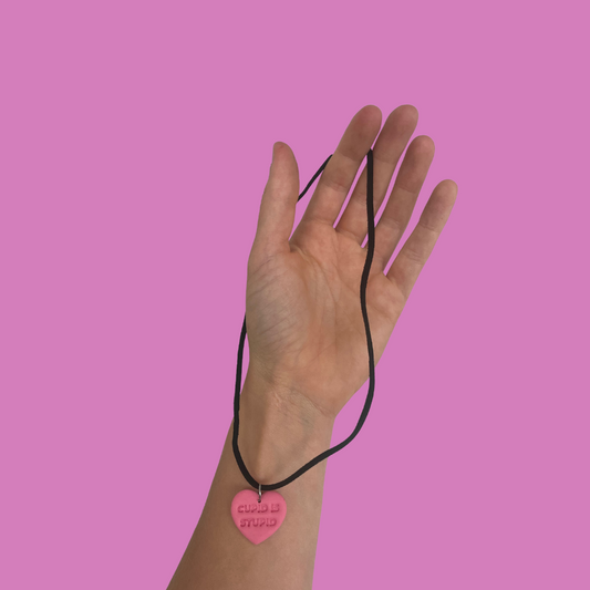 Cupid is stupid stamped pink heart necklace